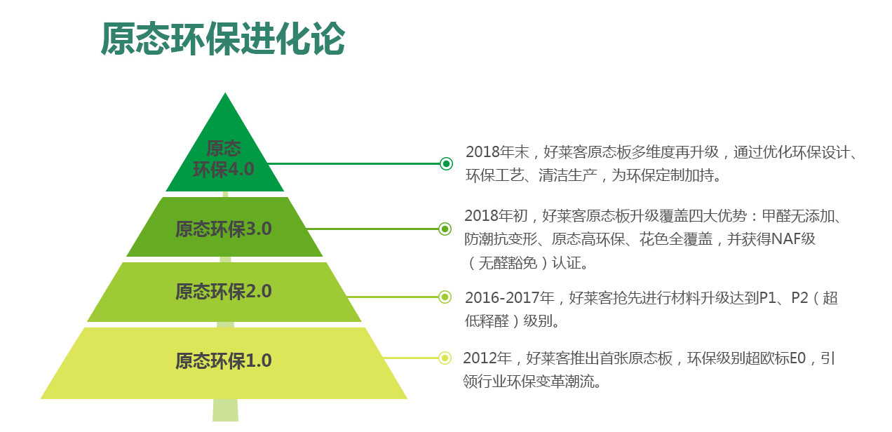 2012年,經(jīng)過潛心研發(fā),好萊客推出高品質(zhì)環(huán)保板材——原態(tài)板,基材選用西南林區(qū)優(yōu)質(zhì)纖維為原材料,加以醫(yī)療、軍事等領(lǐng)域常用的MDI生態(tài)粘合劑制作而成,真正實(shí)現(xiàn)基材甲醛0添加,并獲得由CARB(美國加州空氣資源委員會(huì))頒發(fā)的NAF(無醛豁免)認(rèn)證。至今7年間已升級(jí)至環(huán)保4.0品質(zhì)。