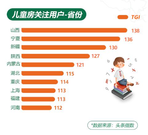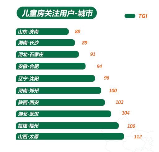據(jù)畫像顯示,關(guān)注兒童房的用戶坐標(biāo)多為新一線城市、二線城市,其中,太原對兒童房的關(guān)注度高居“關(guān)注兒童房城市TOP10”榜首,反映出新一線城市、二線城市家長對孩子成長環(huán)境的重視程度不斷提升。