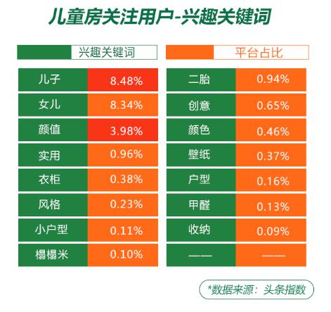 伴隨著消費(fèi)升級,更加多樣化與個(gè)性化的需求不斷涌現(xiàn)。搜集用戶興趣關(guān)鍵詞,TOP3分別為“女兒”“顏值”和“兒子”,區(qū)分性別的量身定制無疑能為孩子打造更加適宜的成長環(huán)境,而高顏值的兒童房設(shè)計(jì)則是沒有年齡界限的普遍需求。