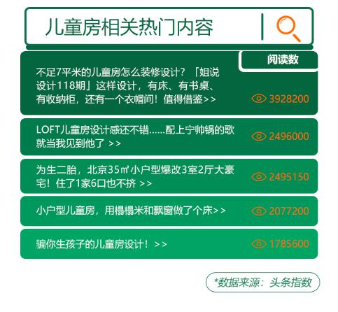 依據(jù)兒童房相關(guān)熱門文章TOP5,關(guān)于設(shè)計(jì)的討論一再成為焦點(diǎn)。受全面二胎政策影響,不少家庭重新考慮新生兒的居住需求,兒童房改造問題熱度飆升。而透過熱度趨勢圖,“兒童房定制閱讀數(shù)”與“兒童房閱讀數(shù)”走勢趨于相關(guān),說明定制日益成為兒童房裝修的一大趨勢,整體多功能兒童定制家居越來越受消費(fèi)者青睞。