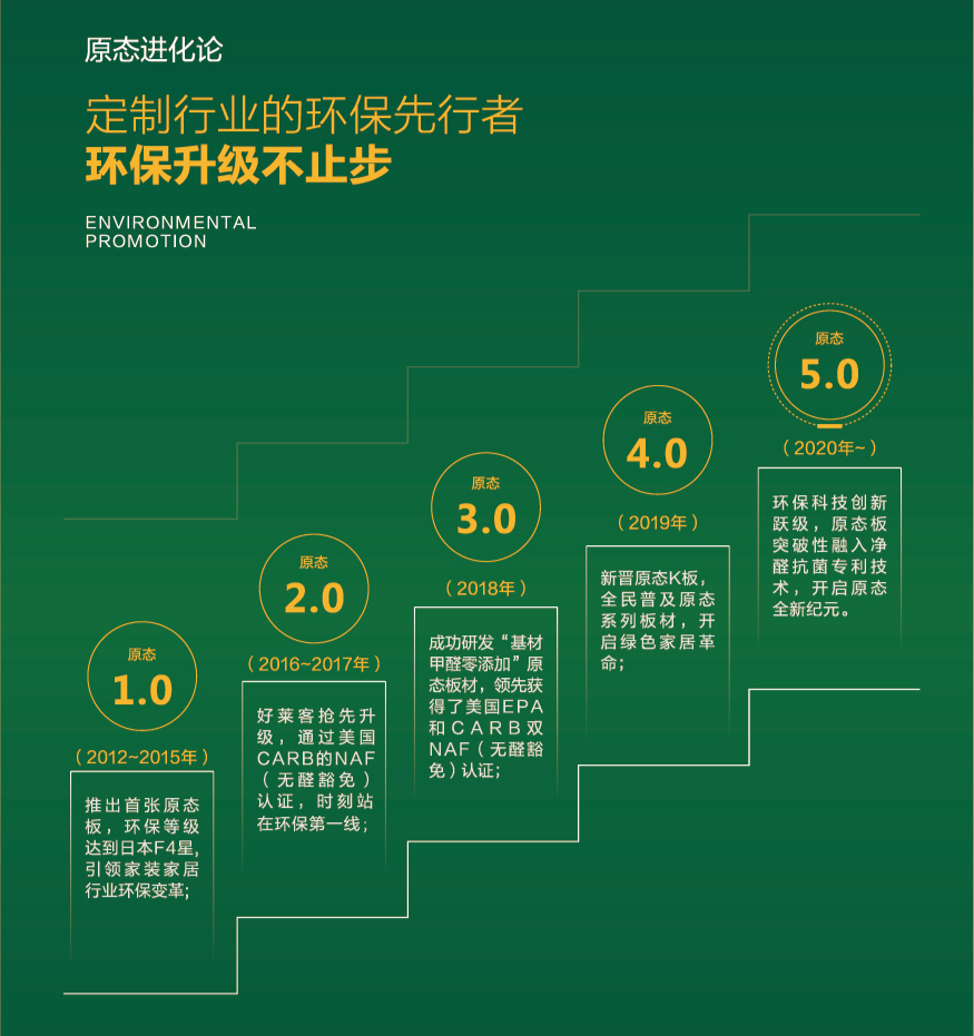原態(tài)1.0:2012年,好萊客領(lǐng)先行業(yè),匠心推出綠色環(huán)保的“原態(tài)板”,引領(lǐng)行業(yè)環(huán)保變革潮流;