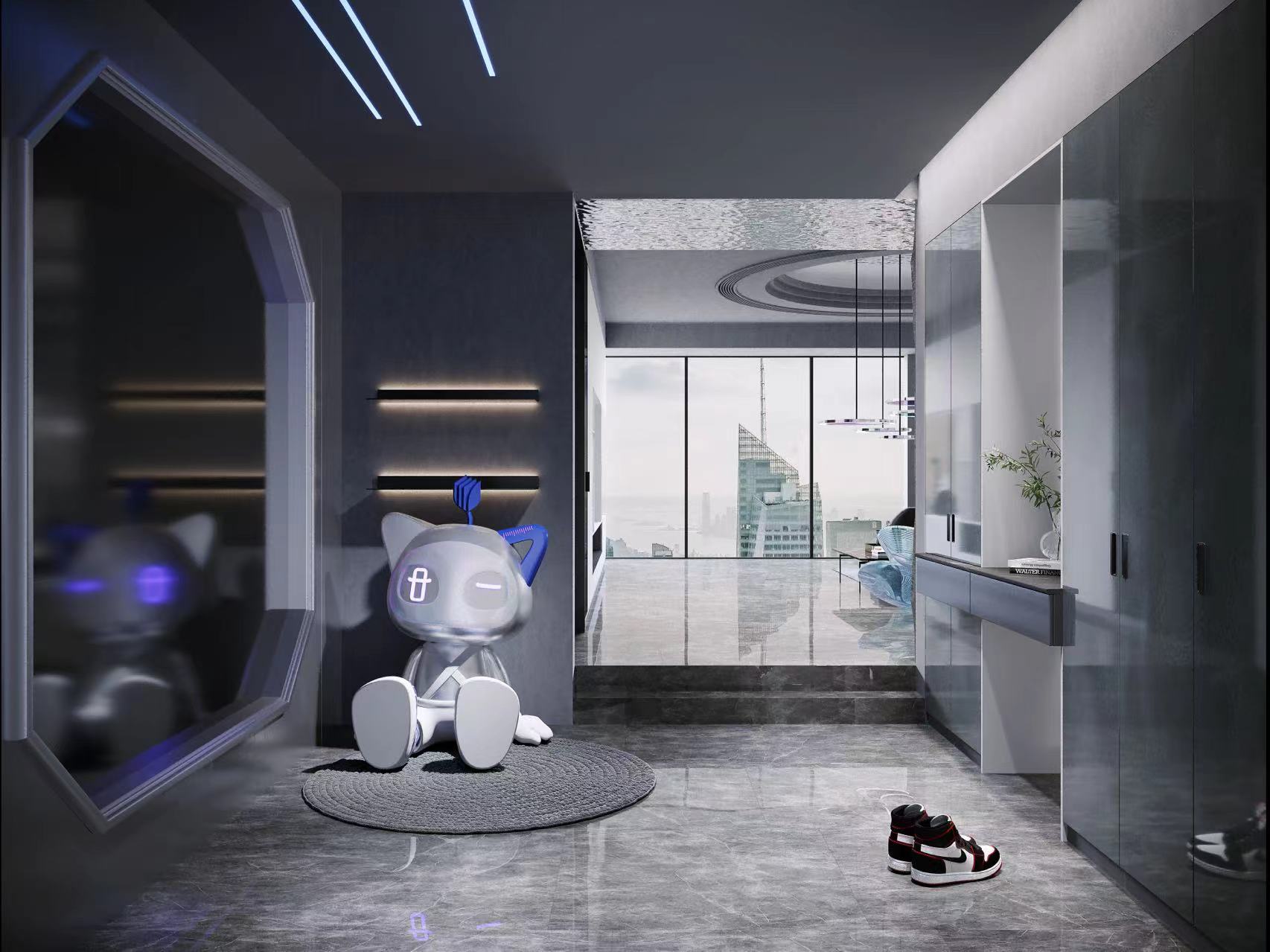 玄關(guān)打破常規(guī)設計,注重個性顏值的同時兼具實用功能。玄關(guān)處的帶燈金屬層板設計,可以擺放潮玩潮品,左側(cè)打造玻璃隔斷“艙門”連接主題空間,營造潮流科技感。