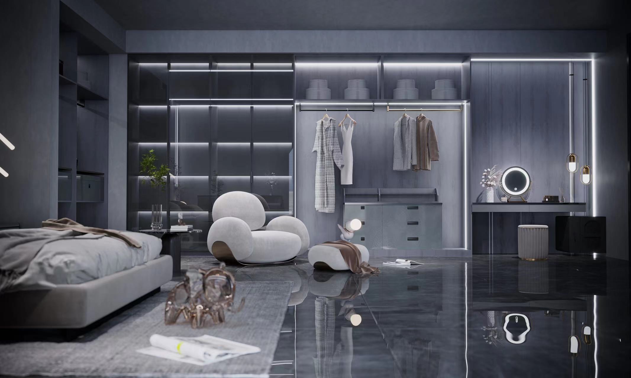 臥室空間以冷灰色調(diào)為主,融入無主燈設計,營造個性化睡眠空間,增加開發(fā)柜展示潮玩擺件與收納常用物品,增添空間趣味性。
