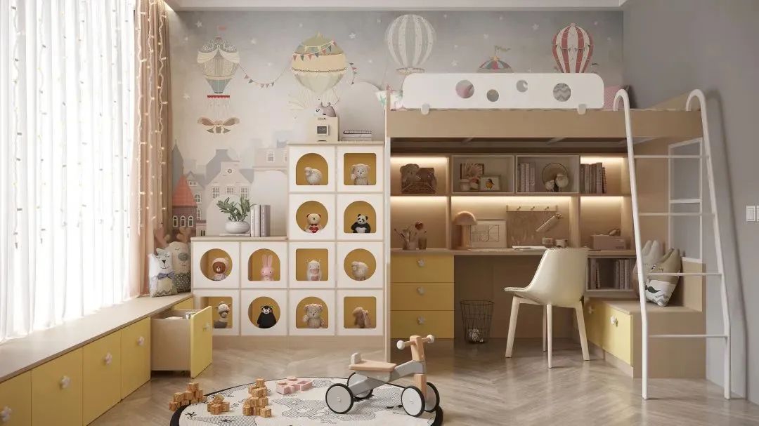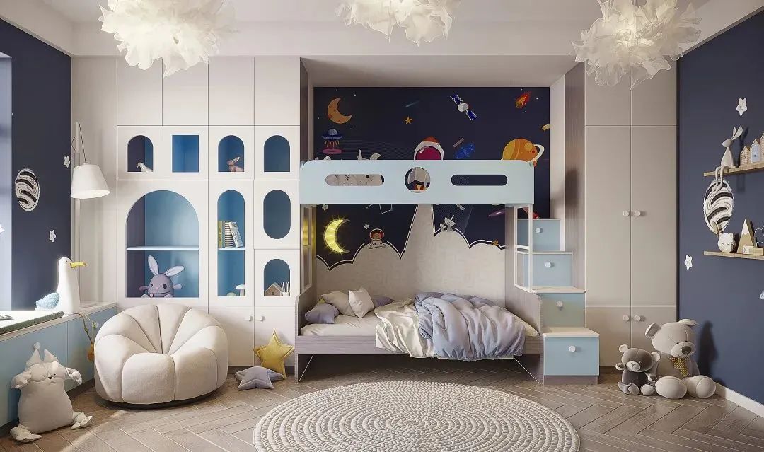在收納空間上,上下床的設(shè)計(jì)不僅節(jié)省了空間,還給二胎家庭的孩子增加交流互動(dòng),床下的書(shū)桌擋板增添了學(xué)習(xí)時(shí)的私密性與沉浸感,床邊的儲(chǔ)物柜與飄窗一體化設(shè)計(jì),極大的滿足了收納的需求。