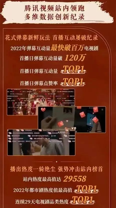 《愛的二八定律》憑借施情華意超甜姐弟戀,代入感極強(qiáng)的女性職場現(xiàn)狀以及爆笑抓馬的日常,一經(jīng)播出,就受到了觀眾的一致好評,成為騰訊站內(nèi)2022年彈幕互動量最快破百萬電視劇,站內(nèi)熱度最高值達(dá)29558,也成為了2022年都市劇熱值度TOP1,更連續(xù)29天霸榜電視劇品類熱度TOP1。