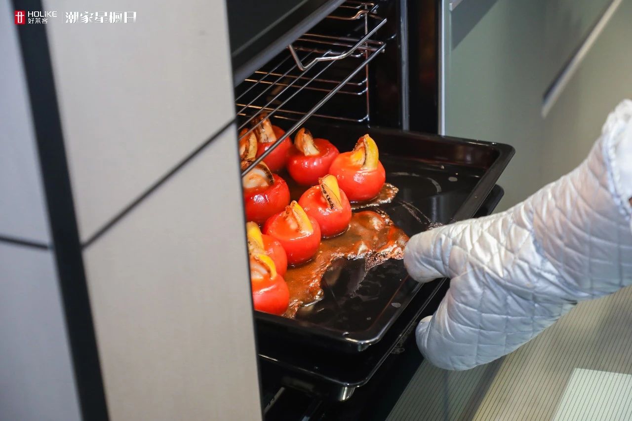 隨后,歐錦和大師將處理好的菜品放入好萊客戰(zhàn)略合作伙伴——倍科的烤箱中烤制。通過烤箱強(qiáng)大的智能烹飪以及精準(zhǔn)控火功能,一道創(chuàng)新精致的大師級菜肴快速出爐。色香味俱全的菜肴吸引了眾多現(xiàn)場觀眾上臺試吃并贊不絕口,紛紛表示種草好萊客健康廚房。