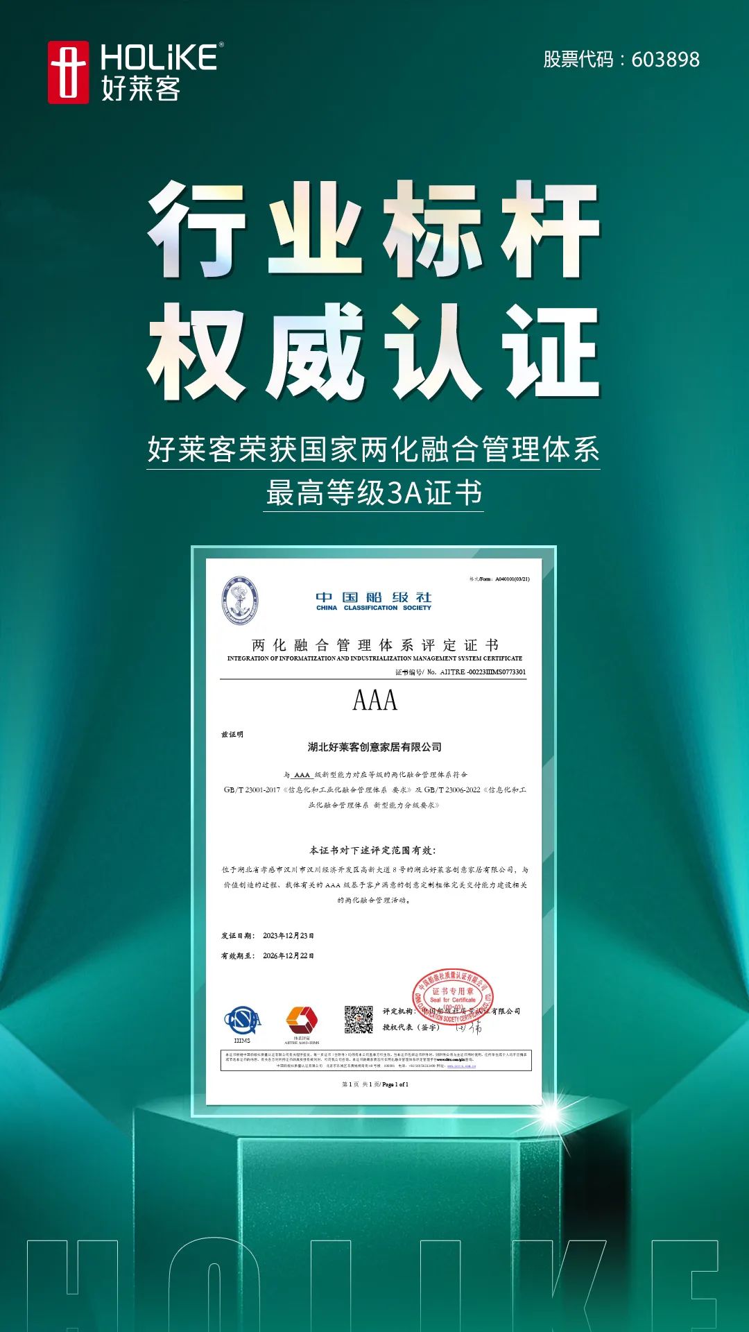 12月23日,好萊客順利通過工信部《信息化和工業(yè)化融合管理體系要求》及《信息化和工業(yè)化融合管理體系新型能力分級(jí)要求》體系認(rèn)證審核,正式取得《兩化融合管理體系A(chǔ)AA級(jí)評(píng)定證書》。AAA級(jí)(領(lǐng)域級(jí))是目前兩化融合管理體系可申請(qǐng)的最高認(rèn)證等級(jí),能夠獲此殊榮,標(biāo)志著好萊客信息化與工業(yè)化、數(shù)字化的深度融合獲得國家權(quán)威認(rèn)可,同時(shí)也為好萊客加快推進(jìn)數(shù)字化轉(zhuǎn)型開啟了新篇章。